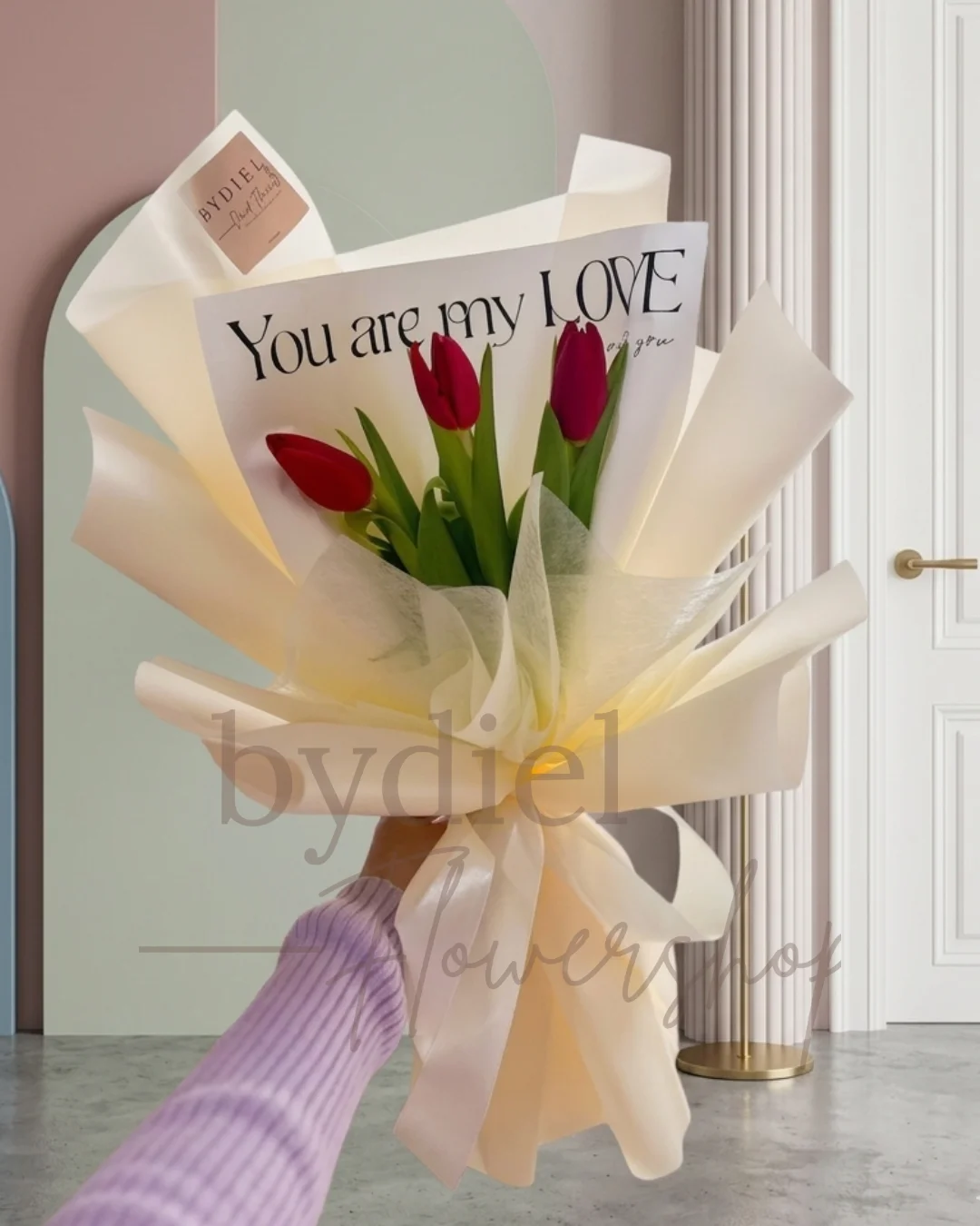 Romantic bouquet of 3 tulips wrapped in cream paper with decorative bow.