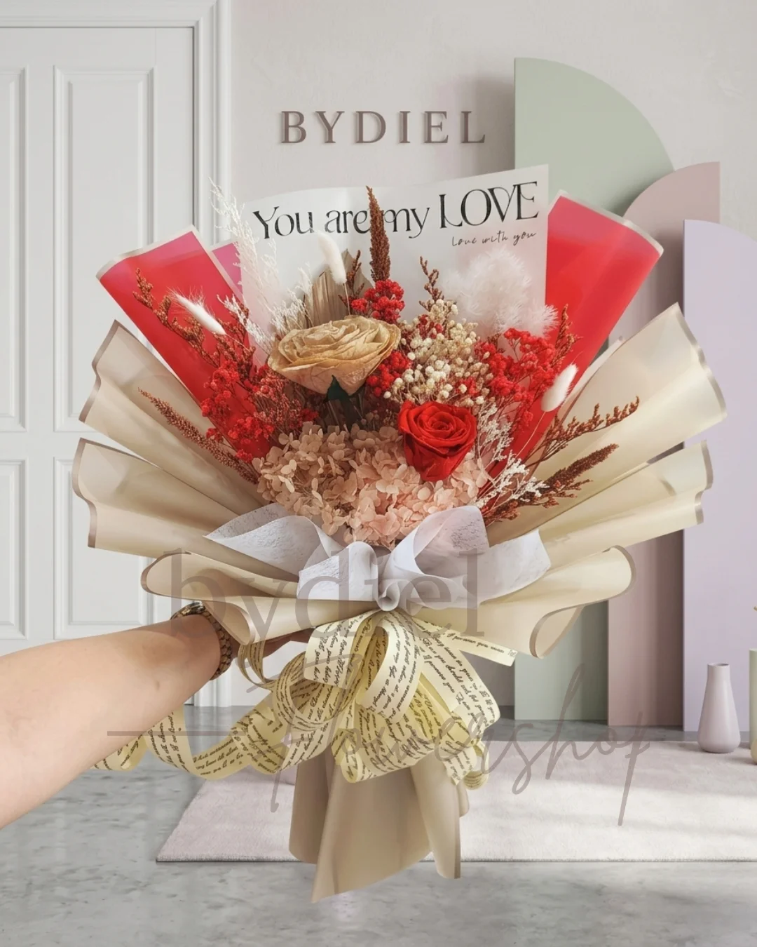 Romantic bouquet of preserved blooms with red accents & luxe wrapping. A timeless gift of love & elegance.