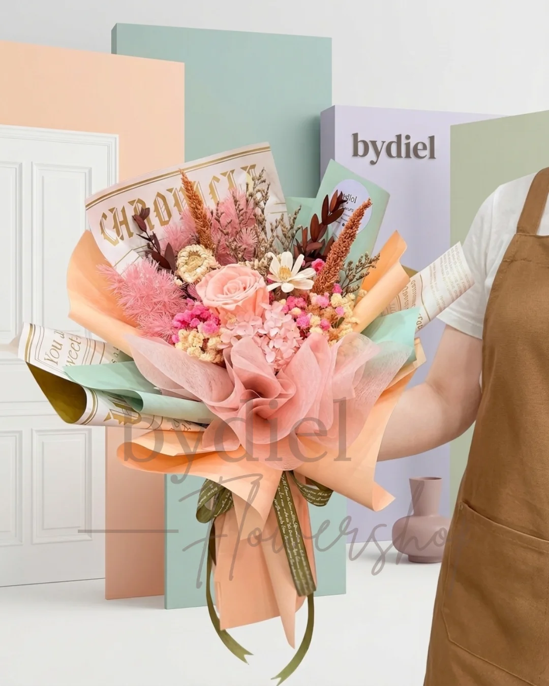 Handcrafted mix of roses, hydrangeas, pampas grass, and preserved foliage. Wrapped in pastel peach, mint green, and beige layers with printed accents,...