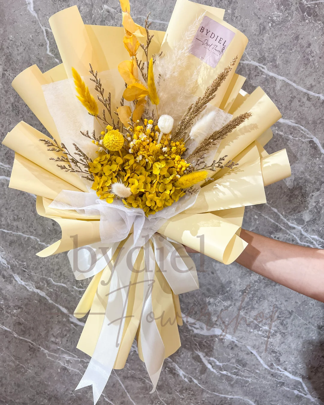 Elegant dried flower bouquet featuring yellow billy balls, white fluffy stems, and beige grasses, wrapped in soft yellow paper with a white ribbon. A ...