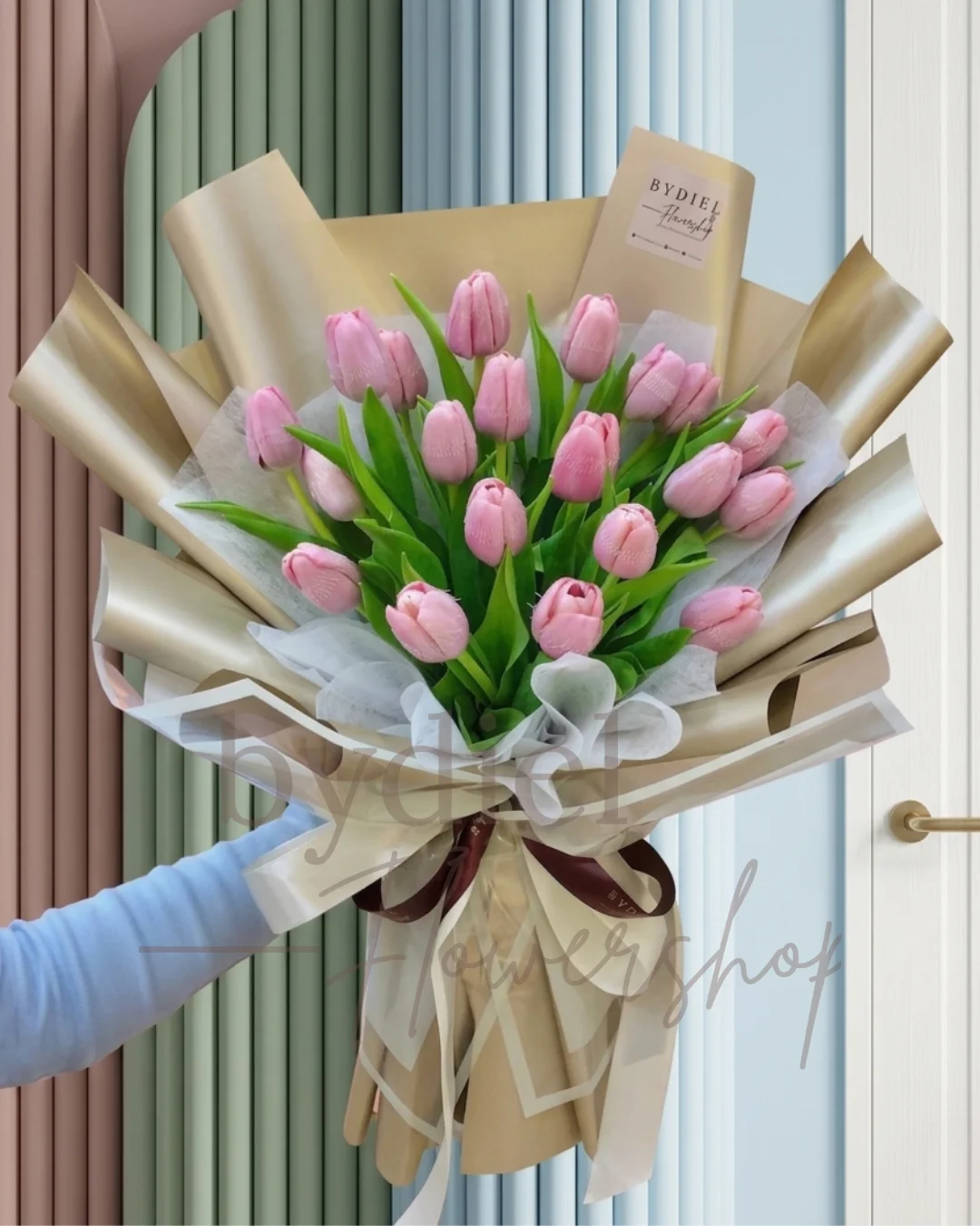 Romantic bouquet of 20 tulips wrapped in cream paper with decorative bow.