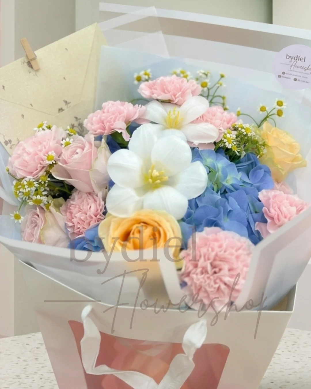 premium tulips, imported roses, hydrangea, carnations and chamomile flowers
