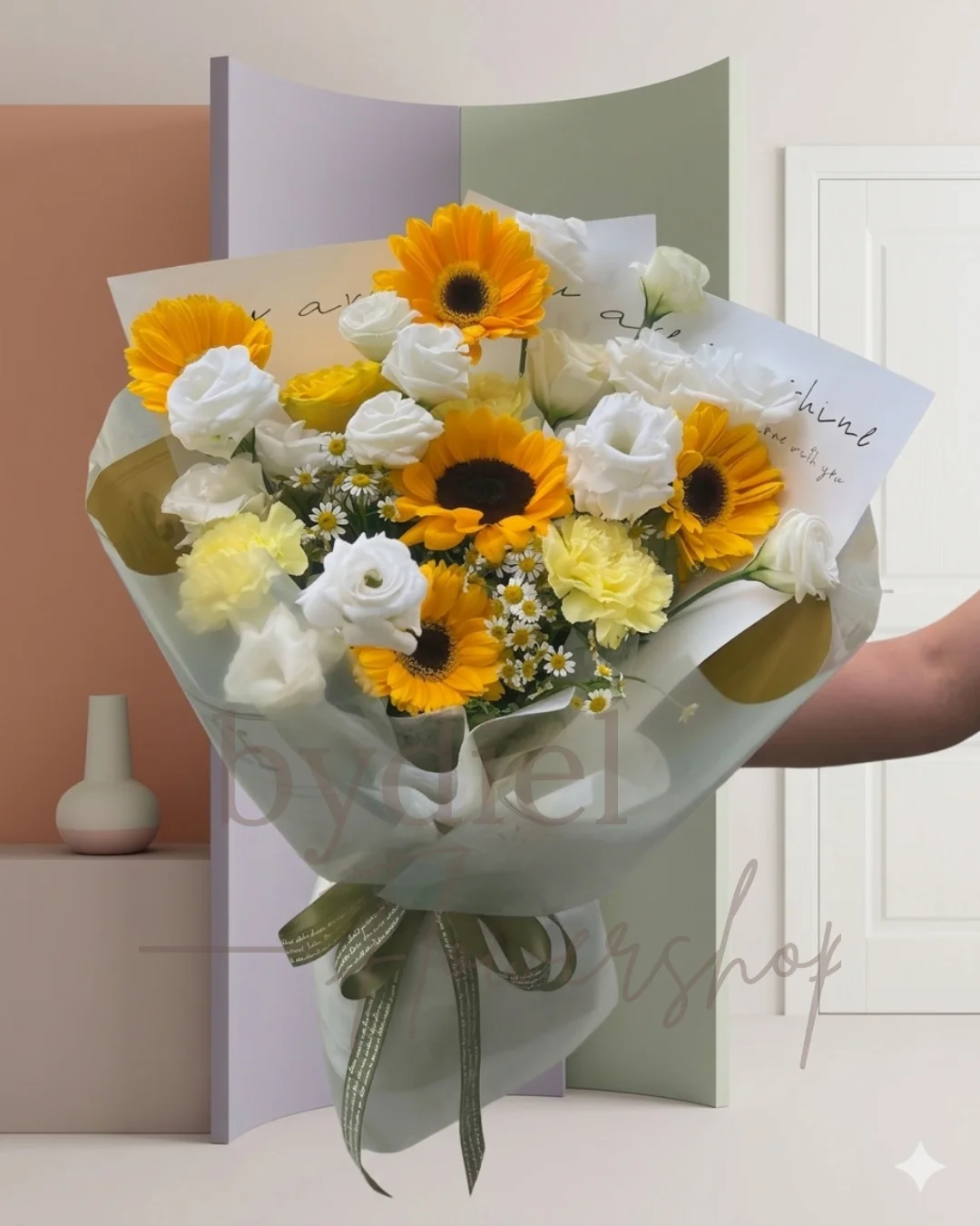 Features with sunflower, imported rose, gerbera, carnation, lisiantus flowers and chamomile