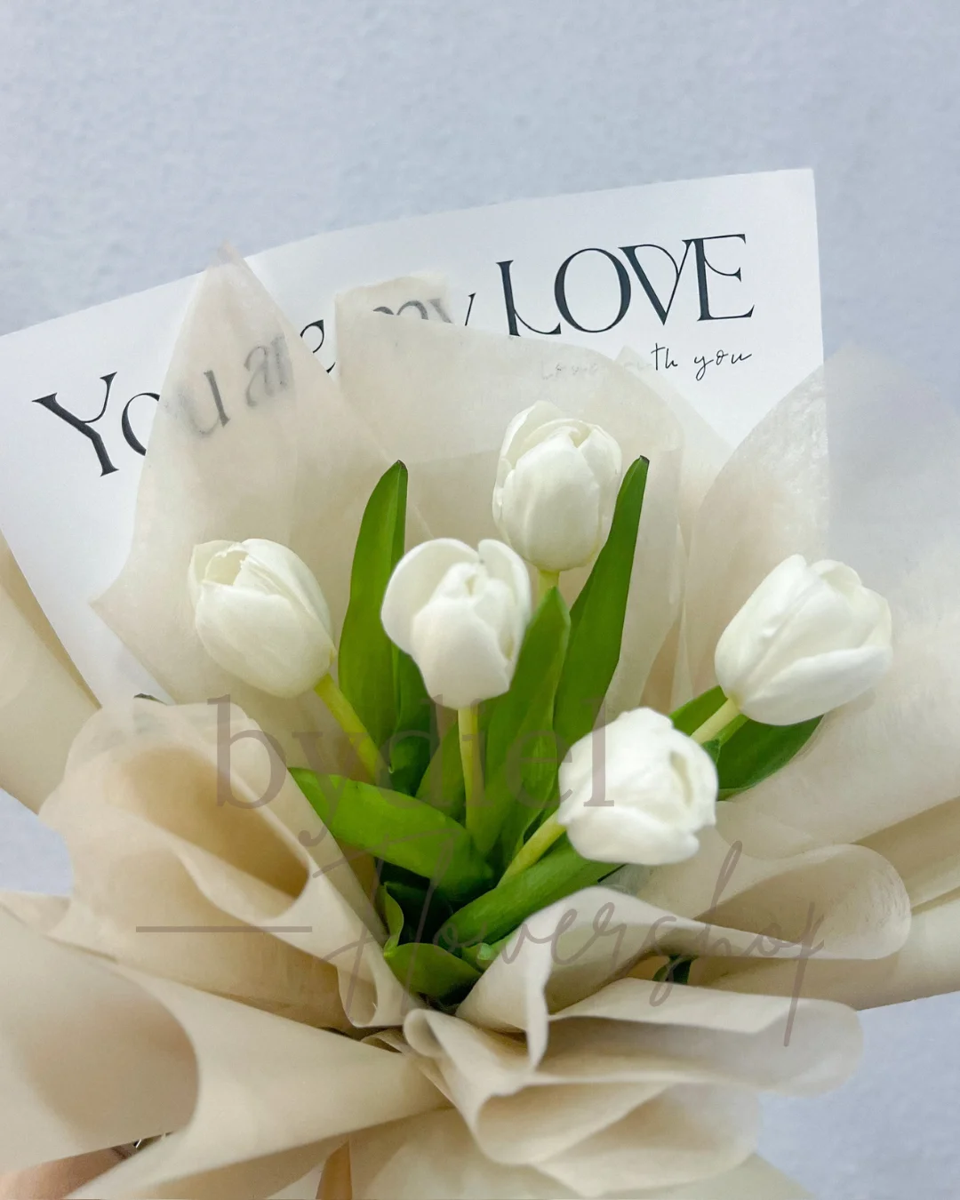 Romantic bouquet of 5 tulips wrapped in cream paper with decorative bow.