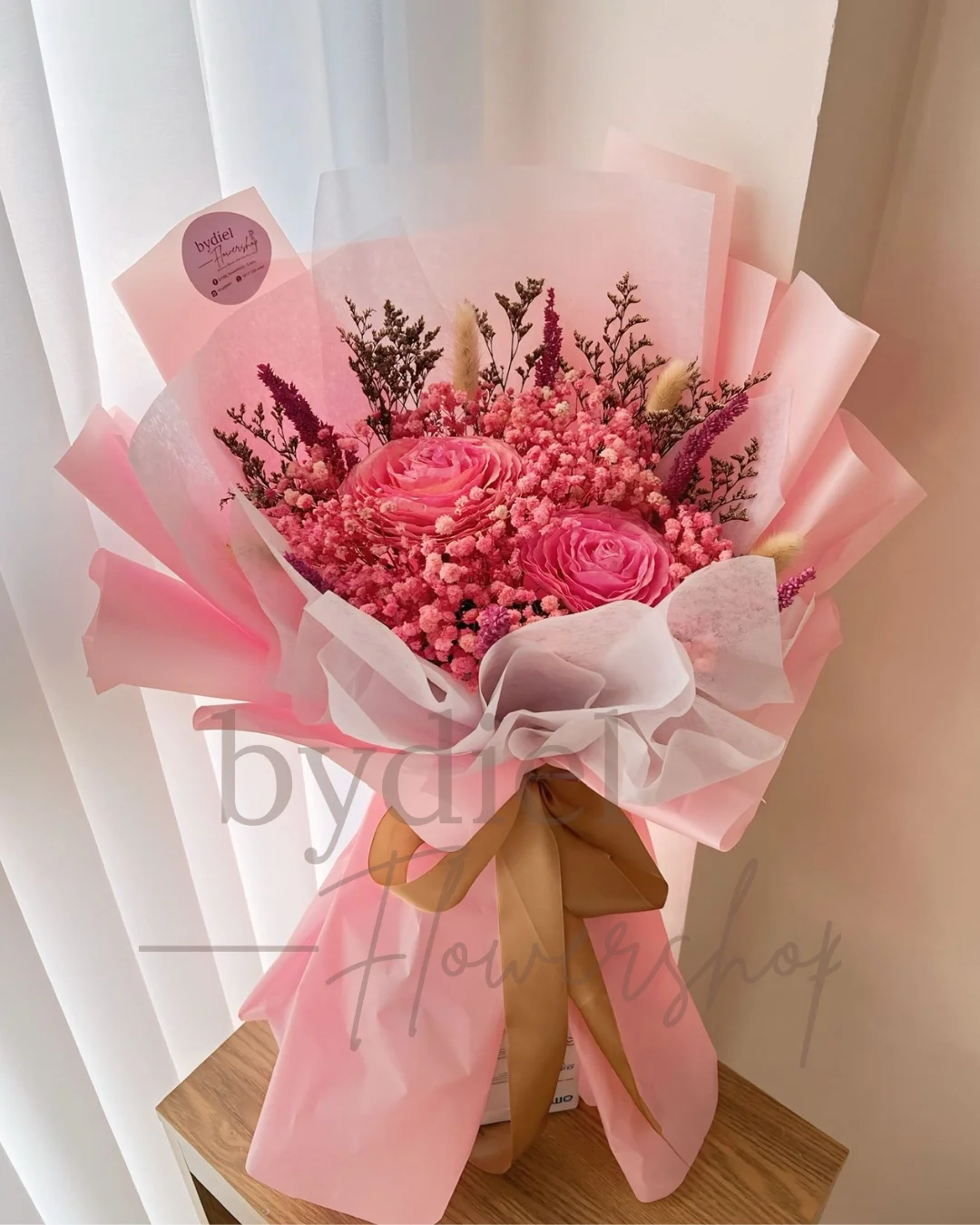 Elegant medium bouquet of pink roses, dried blooms, and fillers wrapped in luxe paper with satin ribbon — perfect for timeless gifting.