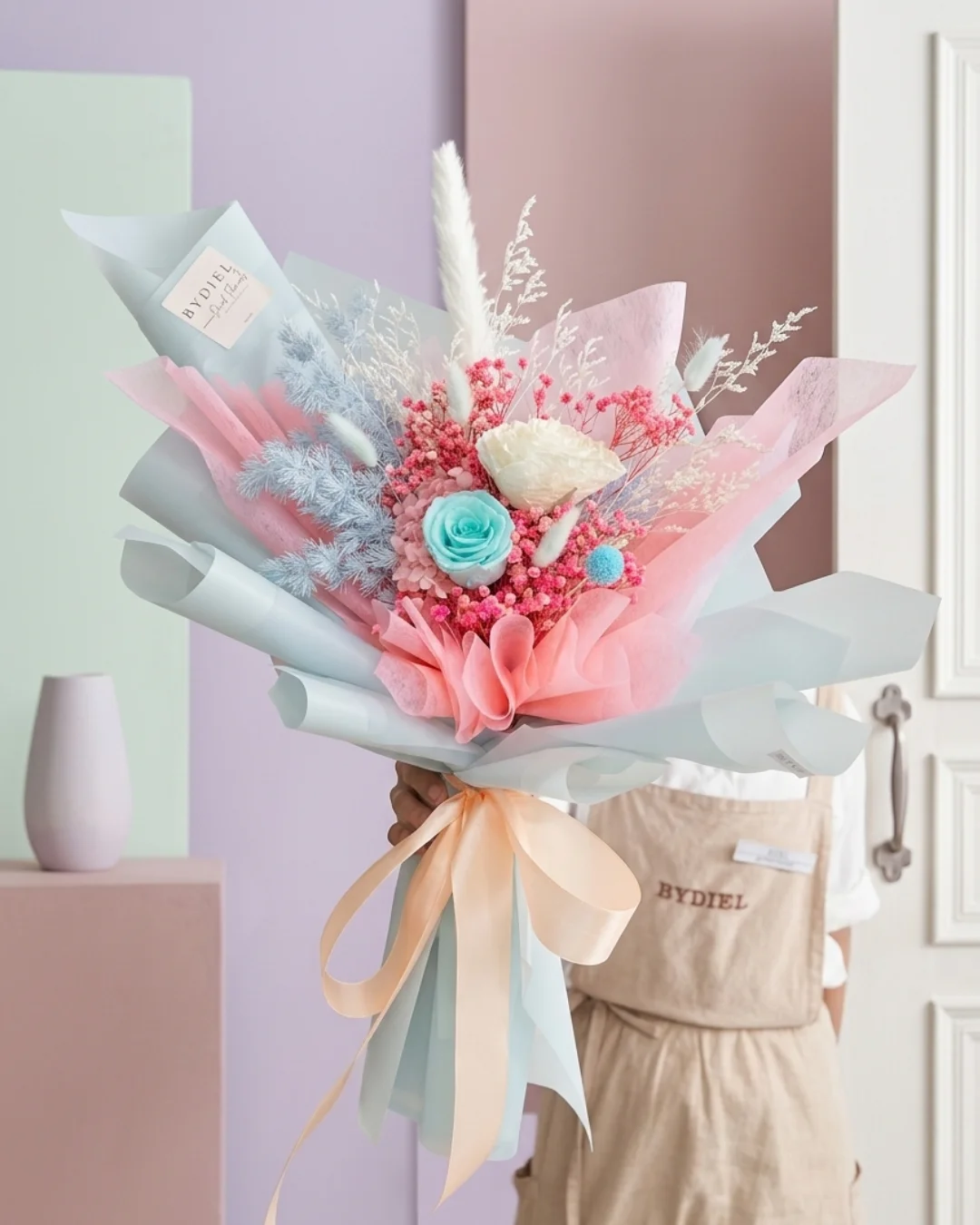 Delight in the elegance of the Pastel Preserved Bouquet—a handcrafted arrangement featuring turquoise roses, pink and white dried blooms, and delicate...
