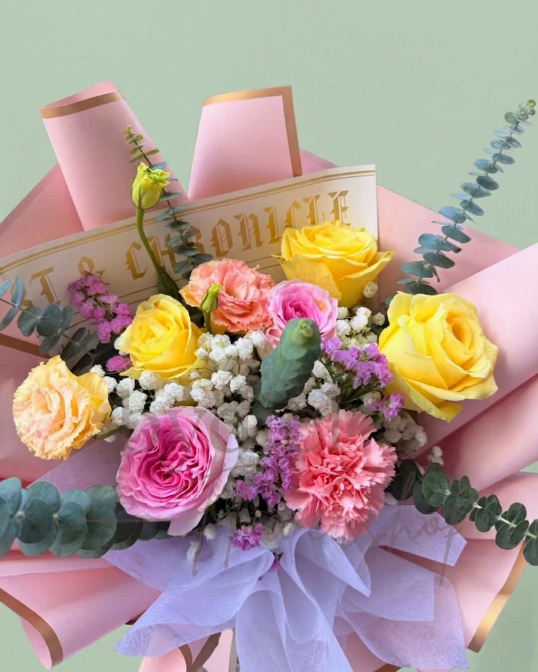 5 imported roses w/ carnation, lisiantus, other flower accessories