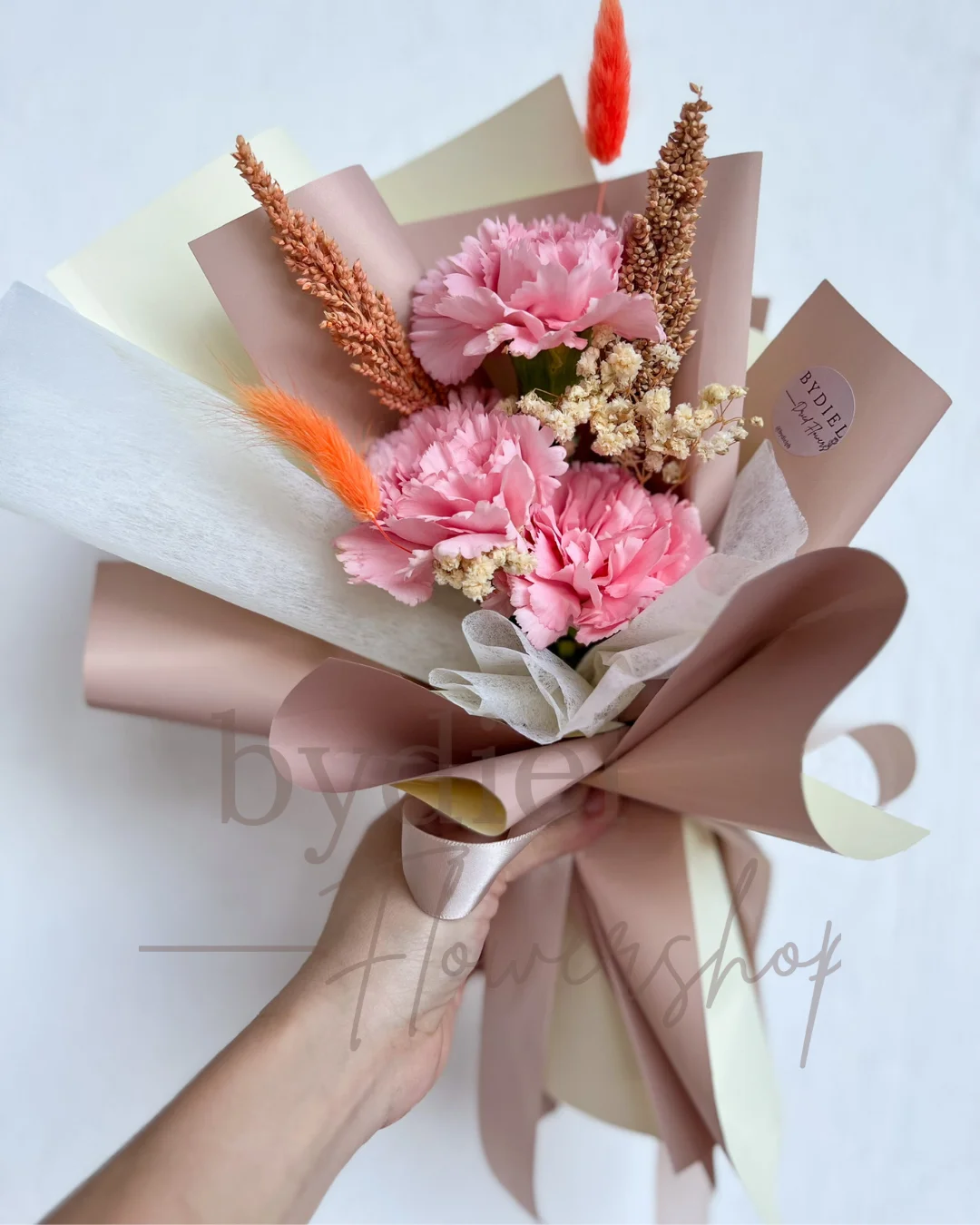 Featuring carnations, beige dried flowers, and orange accents, wrapped in pastel cream, beige, and blush paper with satin ribbon.