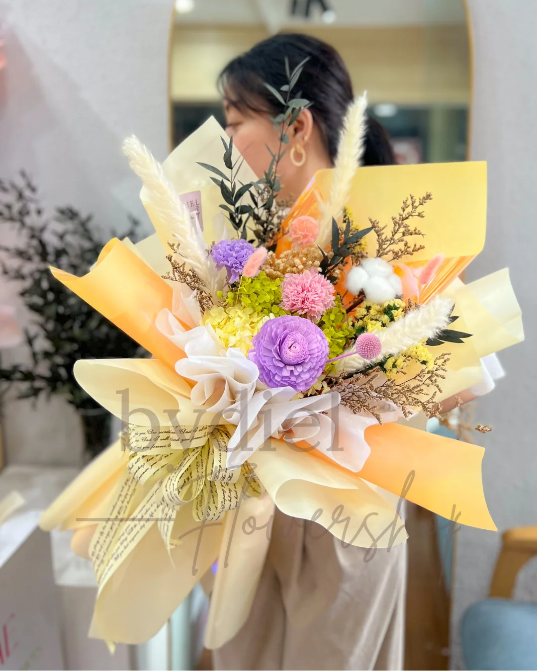Colorful bouquet with roses, pampas & dried blooms in purple, pink & yellow, wrapped in pastel layers for joyful gifting