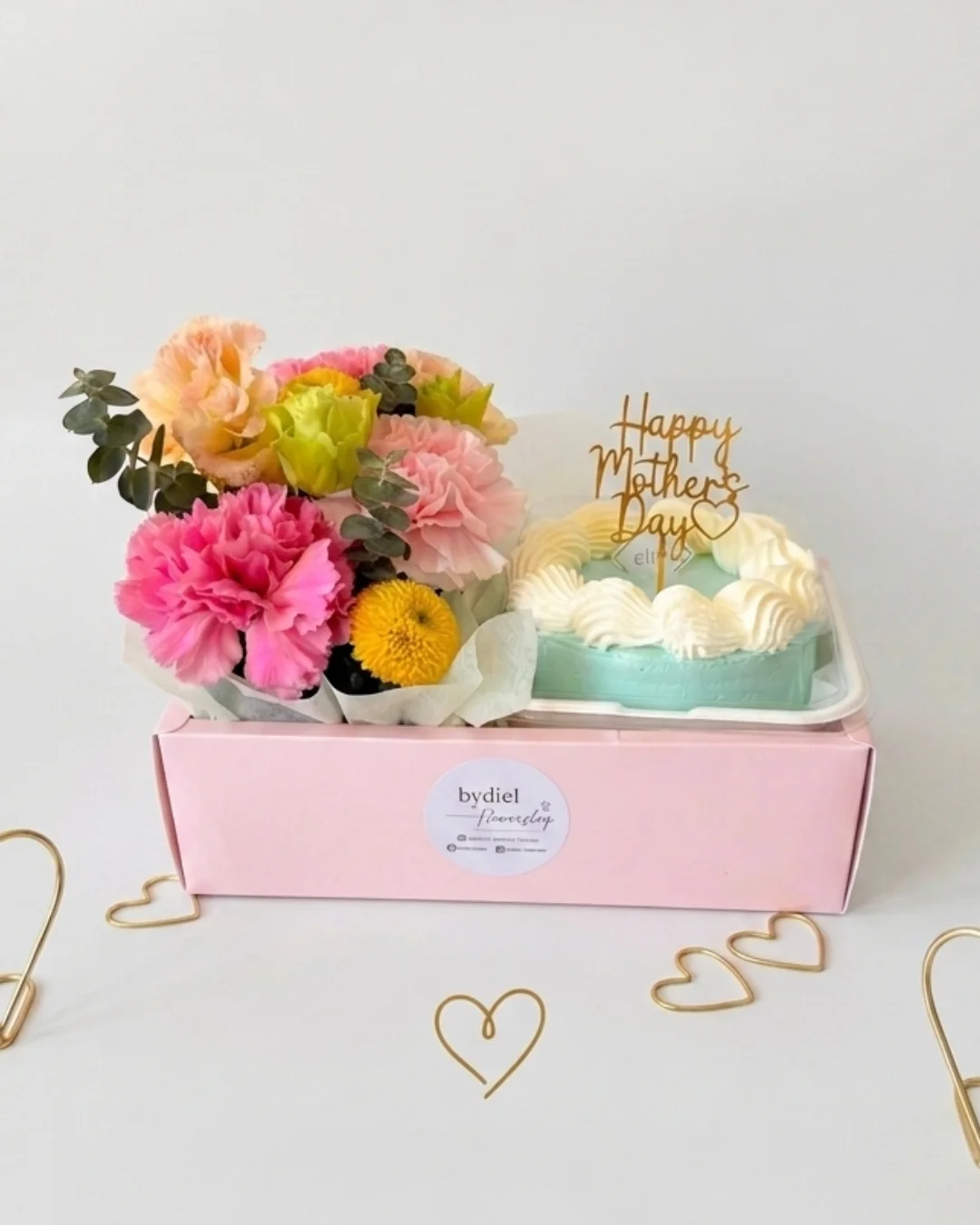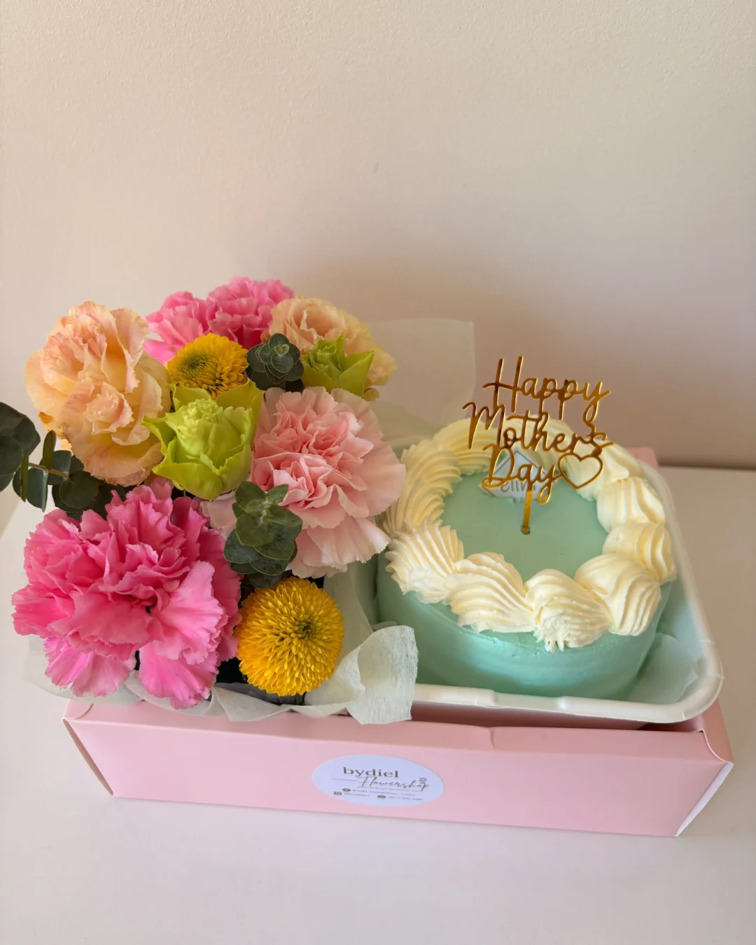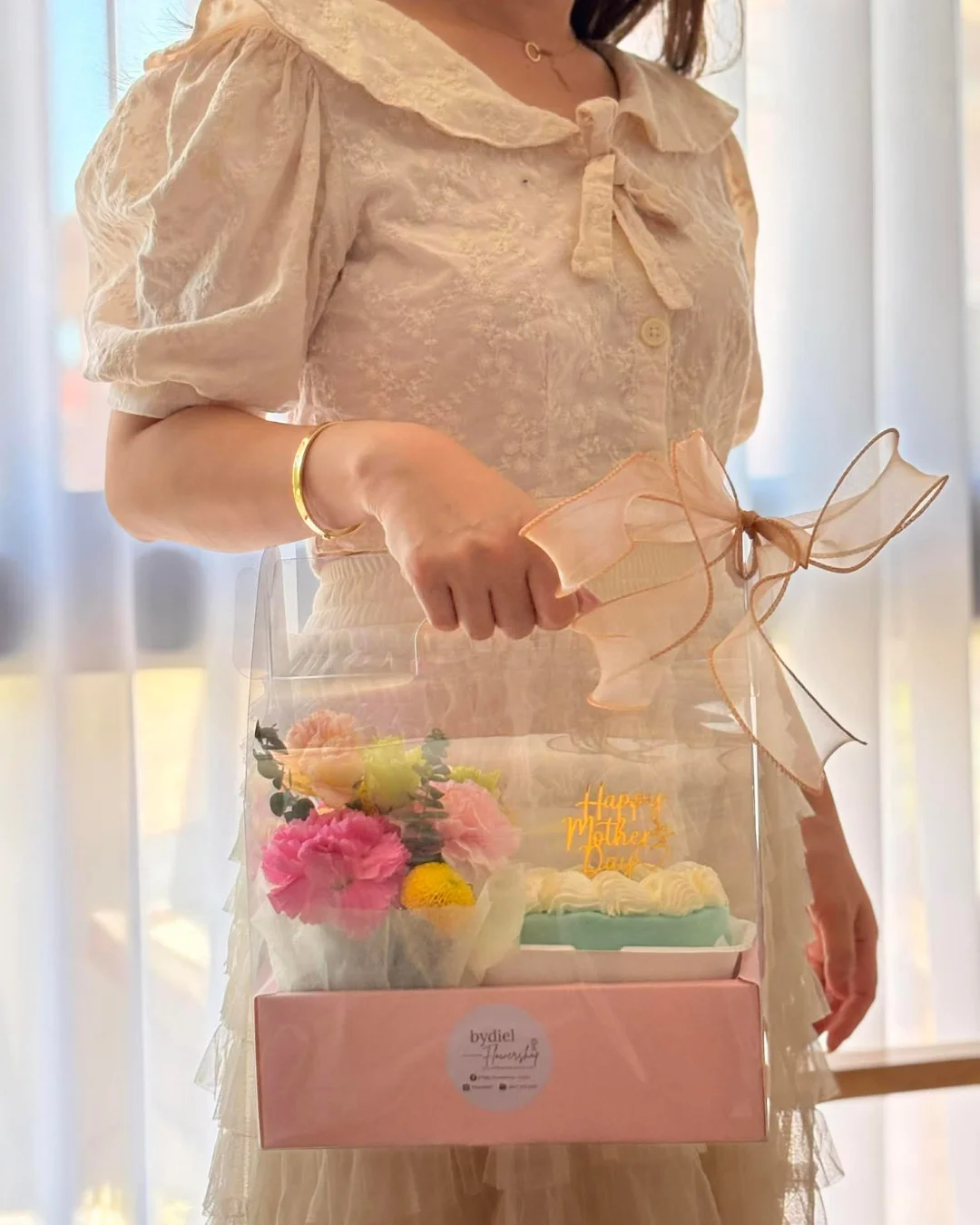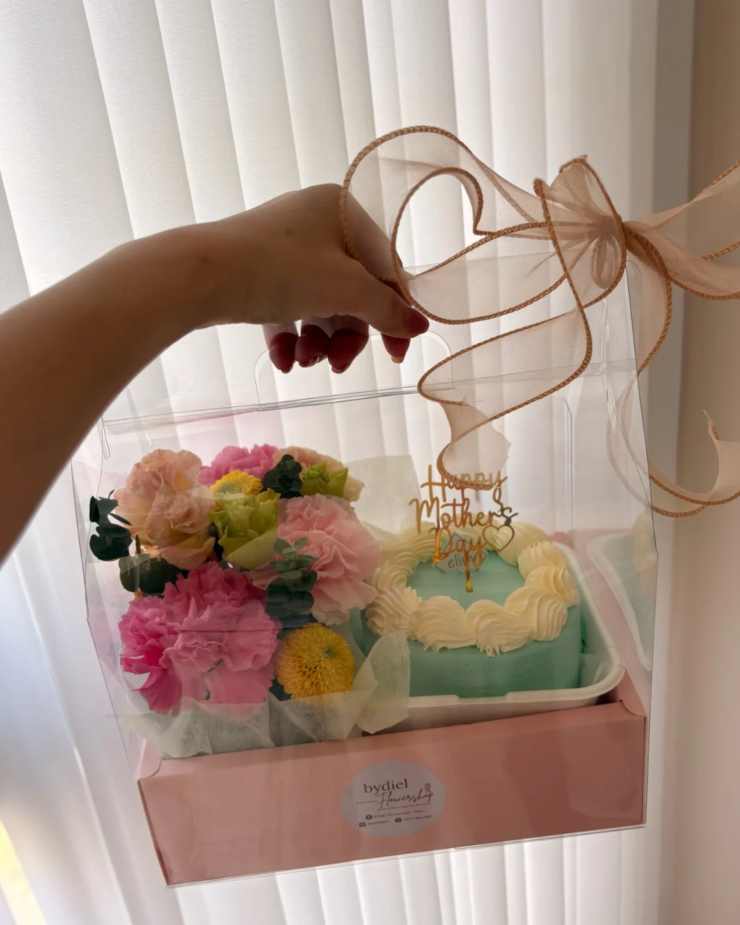 Elegant Mother’s Day gift box with cake & flowers, wrapped with peach ribbon for heartfelt celebration