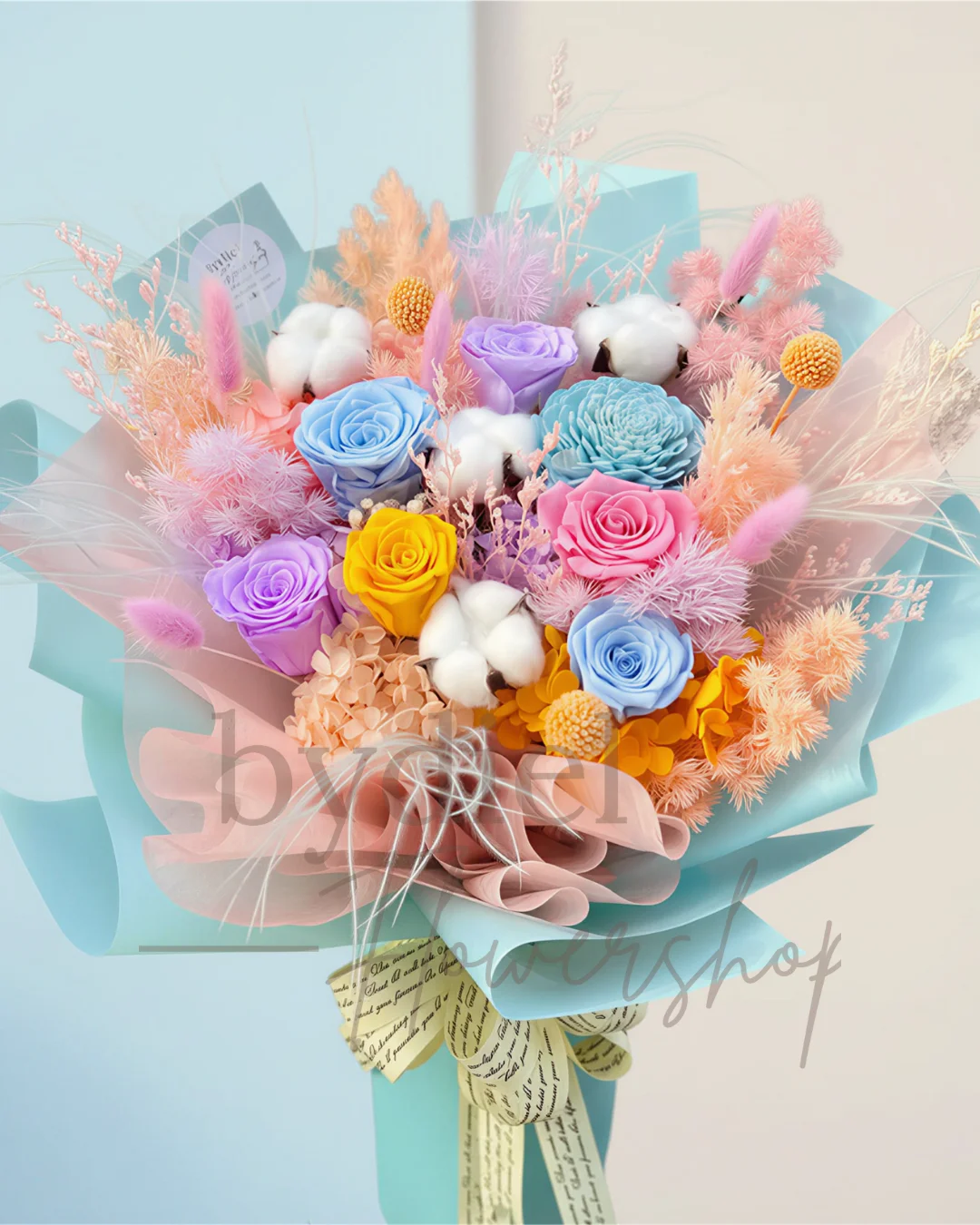 A vibrant pastel bouquet featuring 6 preserved colorful pastel roses, 4 cotton flowers,1 big sola flower wrapped in soft teal and peach layers with el...