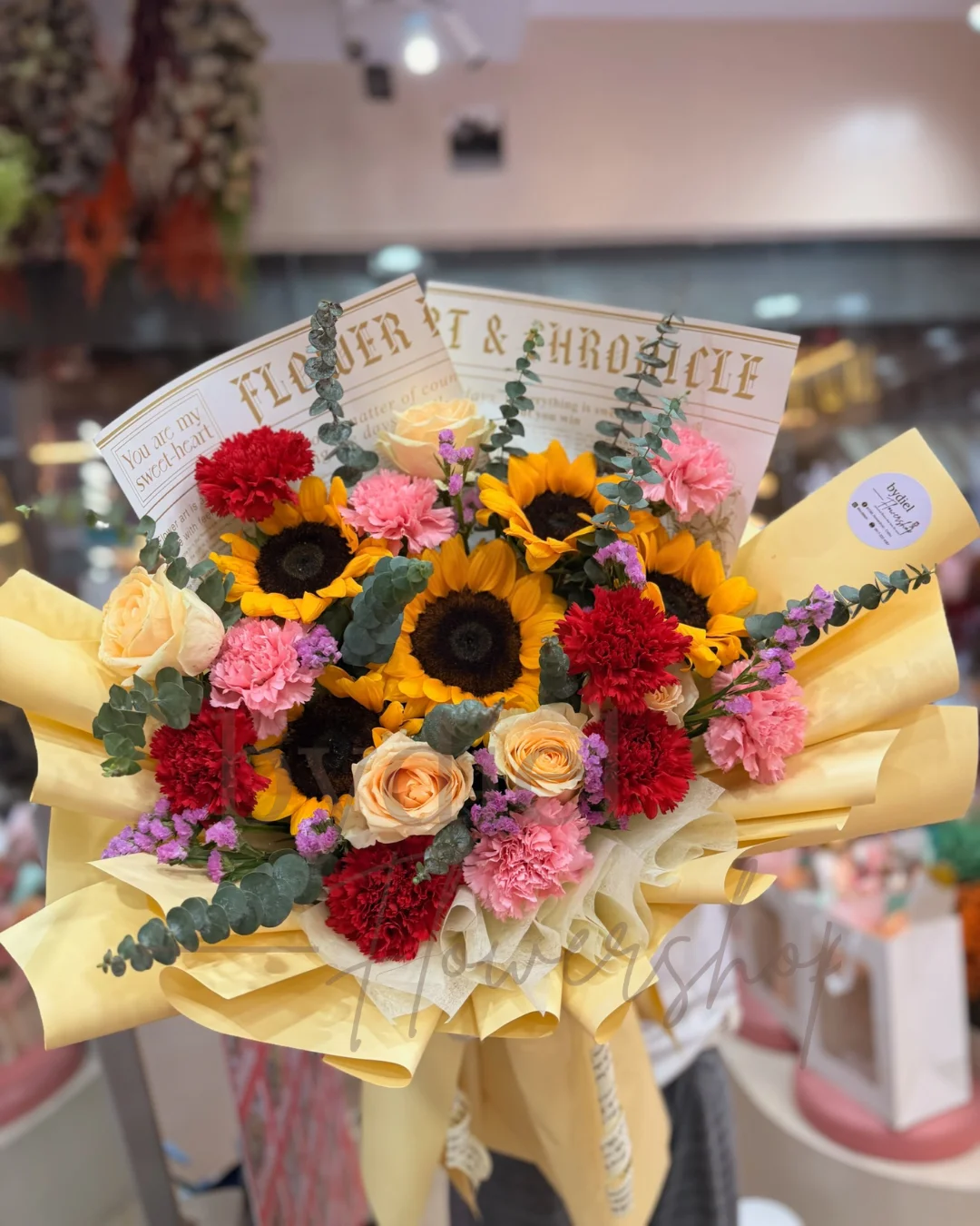 with 5 pcs sunflower, 5 pcs imported rose, carnation flowers & other flower accessories