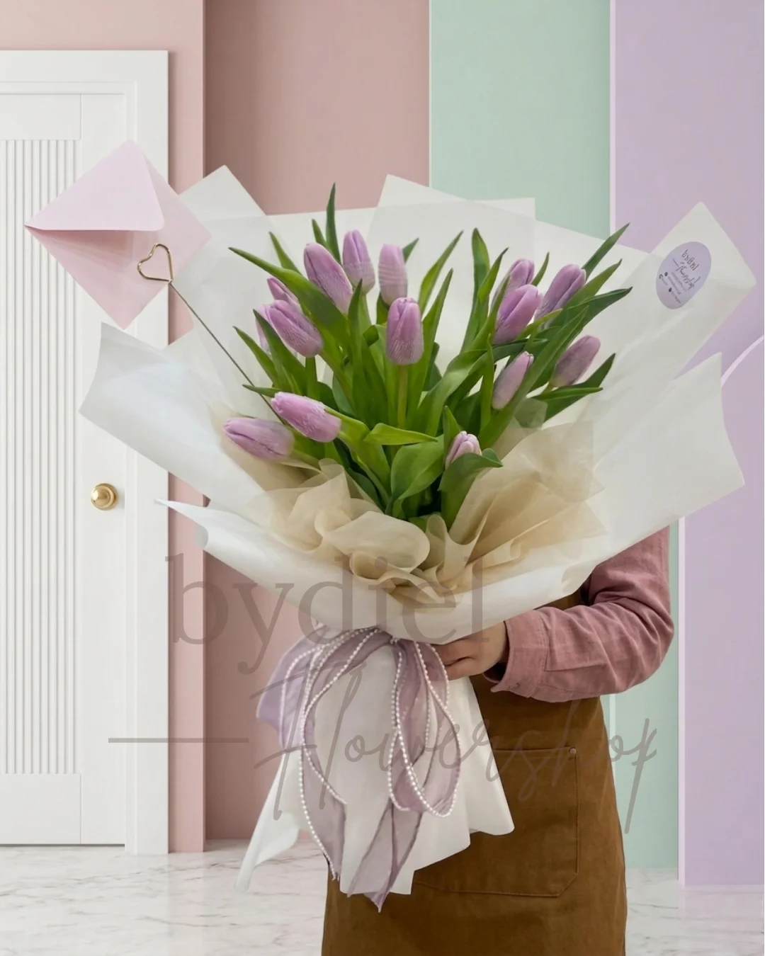 Romantic bouquet of 15 tulips wrapped in cream paper with decorative bow.