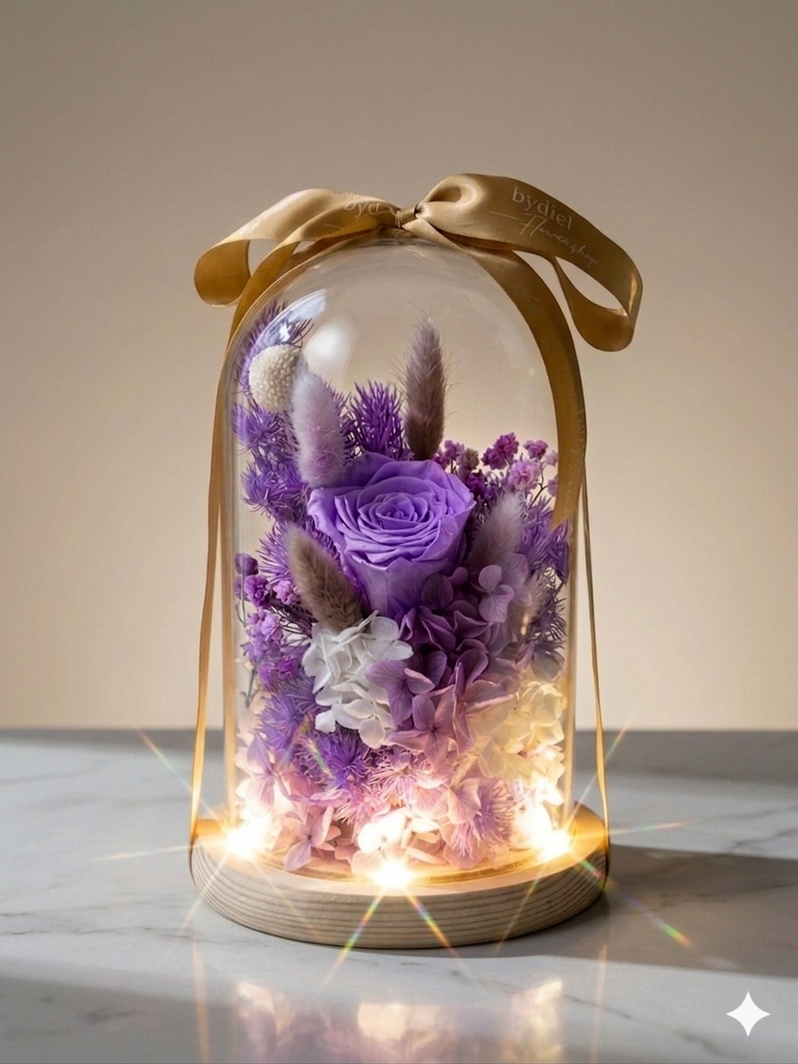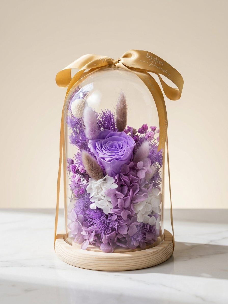 Elegant, preserved purple rose in a glass dome with hydrangeas & dried blooms. A timeless floral gift perfect for anniversaries, birthdays & home déco...