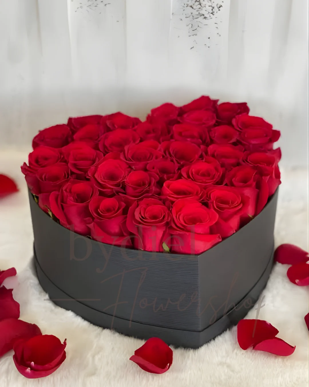 Romantic heart-shaped black box filled with local fresh roses.