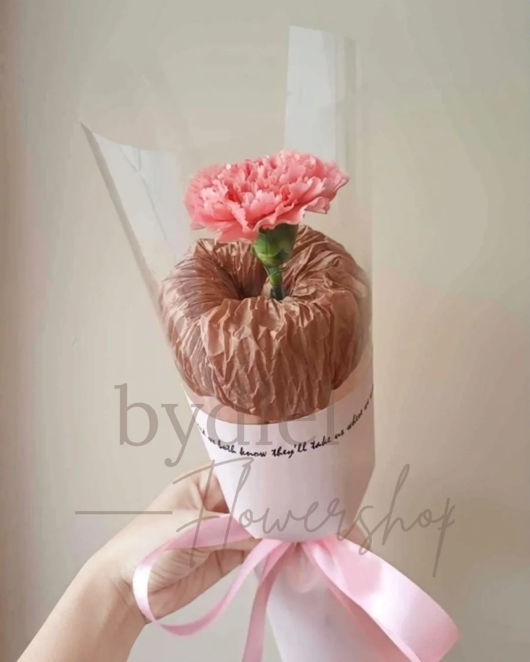 Elegant single carnation wrapped in premium brown crinkled paper and white outer sleeve, finished with a ribbon.
