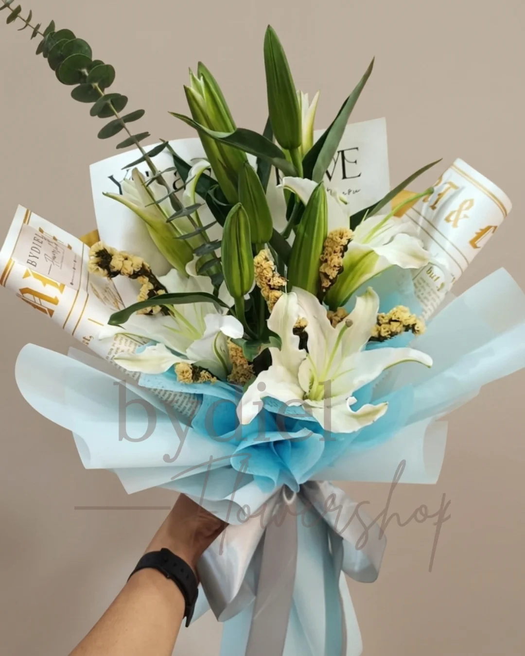 Elegant bouquet of white lilies, unopened buds, yellow fillers, and eucalyptus foliage, wrapped in light blue and white translucent paper with a gray ...