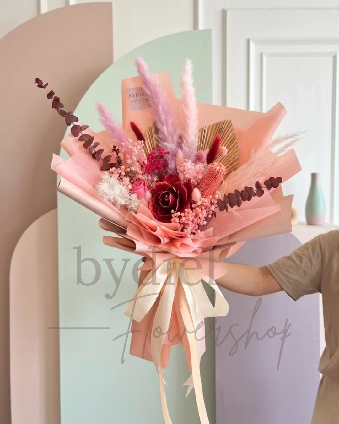 Elegant bouquet of dried & preserved flowers with roses, pampas grass & eucalyptus, wrapped in blush paper—perfect for timeless gifting.