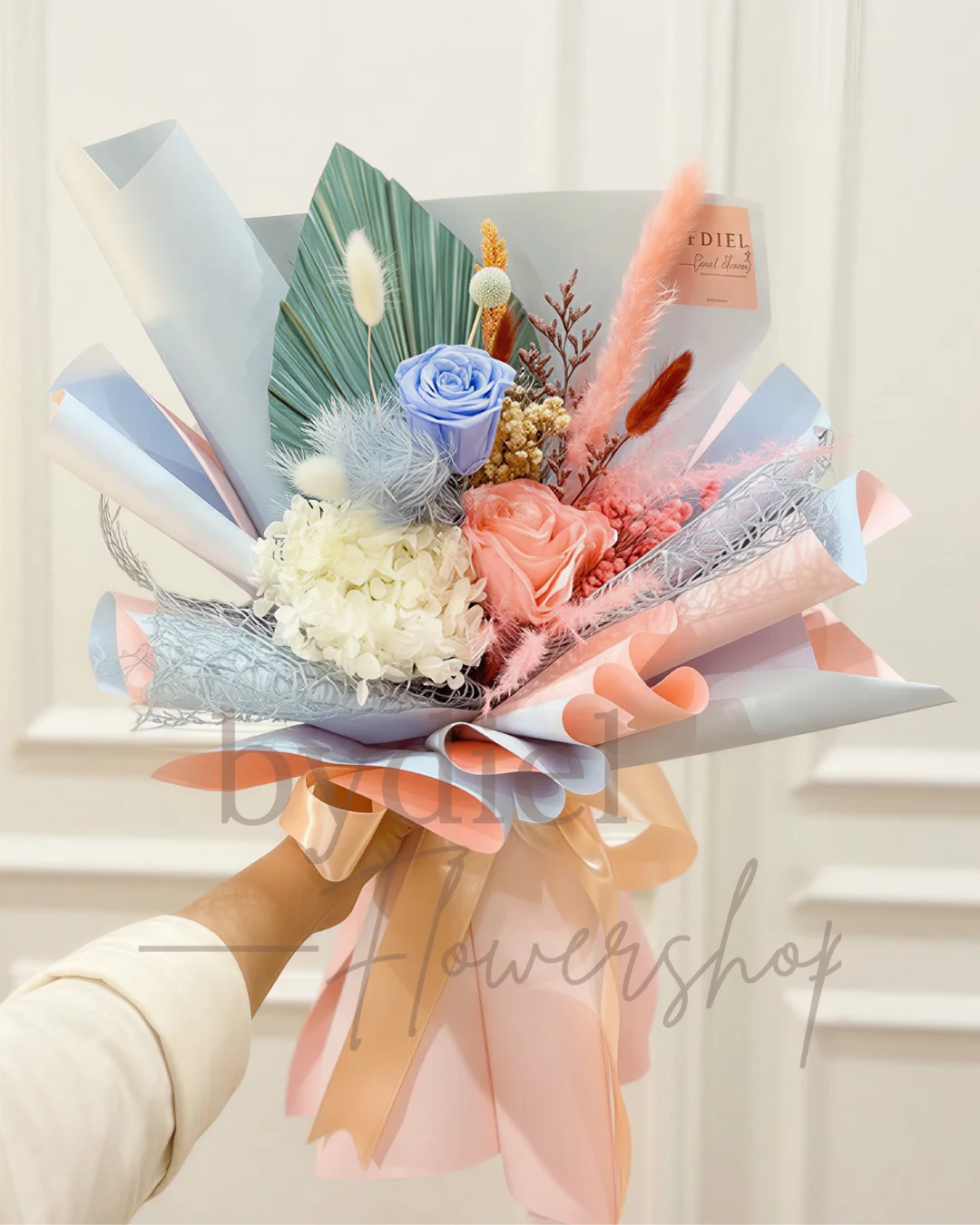 Express elegance with the Pastel Harmony Bouquet—a handcrafted blend of blue and peach roses, white hydrangea, dried grasses, and decorative foliage. ...