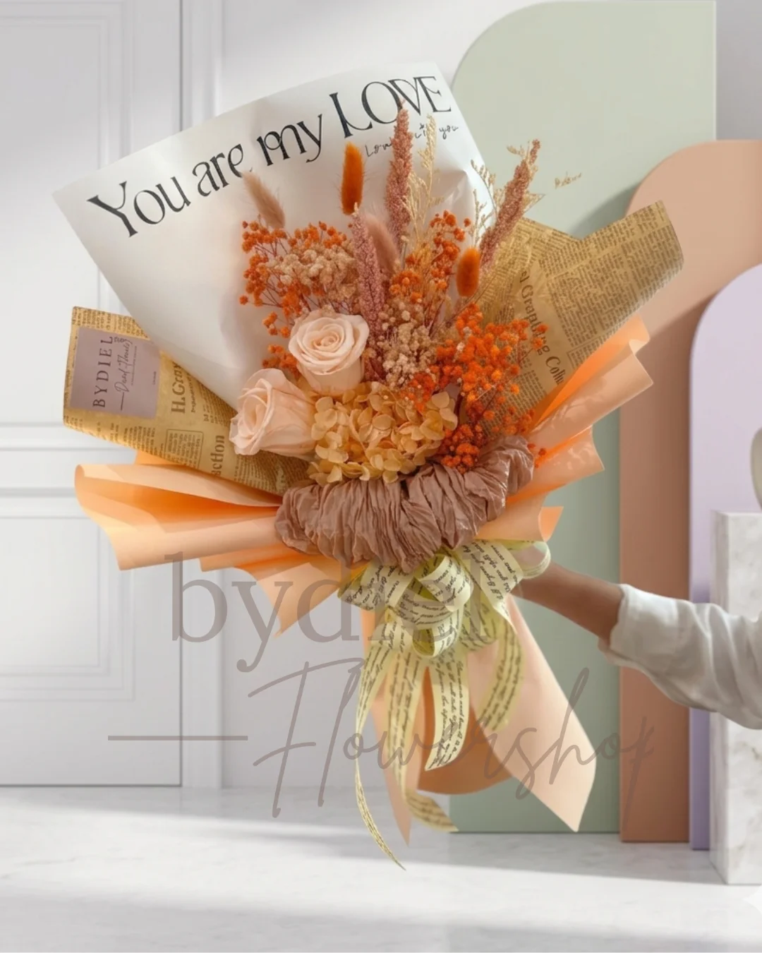 Celebrate timeless romance with the Vintage Cecilia Bouquet—a handcrafted arrangement of peach and orange roses, dried blooms, and ornamental grasses....